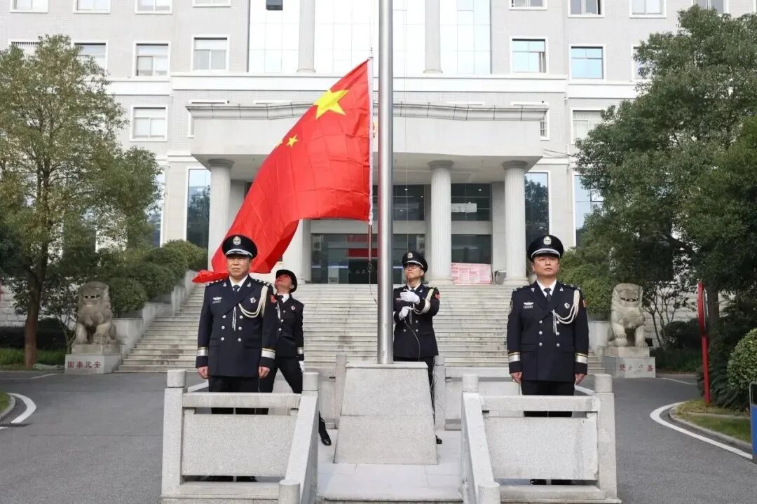 国旗庄严,检徽闪耀。伴随着国旗徐徐升起,中华人民共和国国歌奏响,全体人员面向国旗行注目礼,齐唱国歌。